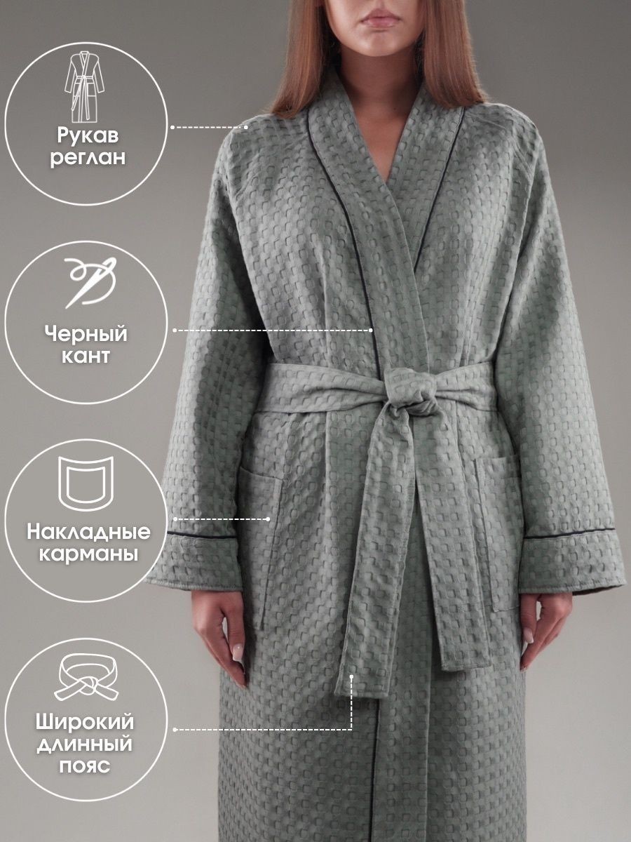 Халат на запах с длинными рукавами реглан, дополнен большими карманами и широким поясом, удобным воротником. Изделие украшает лаконичная отделка - черный кант по вороту, манжету рукава и красота вафельного полотна с нежной ячеистой структурой. Легкий и удобный халат отличается повышенной впитываемостью и отличным внешним видом, который сохранится даже после многочисленных стирок, а ячейки приобретут более выраженную глубину. Плотность полотна - «вафли»: 200 г/кв.м. Мягко облегающая тело ткань (100% хлопок) легкая и дышащая, она прекрасно пропускает воздух, отлично впитывает воду и быстро высыхает. Текстильный халатик дополнен петелькой для подвешивания на крючок. Мягкий и уютный банный халатик без застежки приятно надеть после горячей ванны или бодрящего душа, сауны, бани или бассейна. Удобную вещь можно накинуть на плечи утром сразу после пробуждения, носить дома во время отдыха. Эстетичная модель из натурального материала в фасоне на запах подойдет для беременных женщин и кормящих матерей, для роддома. Изделие выполнено в больших и маленьких размерах от 40-го до 58-го: вы можете подобрать идеально подходящую одежду по таблице размеров на фотографии в левой части карточки товара с подробными мерками. Красивое хлопковое кимоно дополнит гардероб взрослых женщин и девушек, девочек - подростков любого роста: высоких и невысоких, любой комплекции: полных, стройных и худеньких. Вафельный халат с нежным фактурным рисунком - идеальный подарок для любимой девушки, жены, мамы или бабушки на день рождения и любой праздник, приятный свадебный презент или на Новый год. Халатик приобретают, как отельный для гостиниц и отелей, используют для массажа и салоны красоты. Халат безусловно станет хорошим подарком маме, бабушке, подруге или коллеге, а также отличным подарком на новоселье и просто так. рекомендации по уходу: перед первым использованием рекомендуется стирка в холодной воде, затем изделие стирают в деликатном или ручном режиме при температуре воды не выше 40 градусов. Отбеливание и химчистка запрещены, как и сушка на отопительных приборах. Будьте внимательны, соблюдайте рекомендации, возможна усадка после стрики. Сушить в естественном виде на плечиках, гладить с паром при температуре 150 градусов. Халат поставляется в эстетичной упаковке - удобной сумке на молнии, с ручкой.