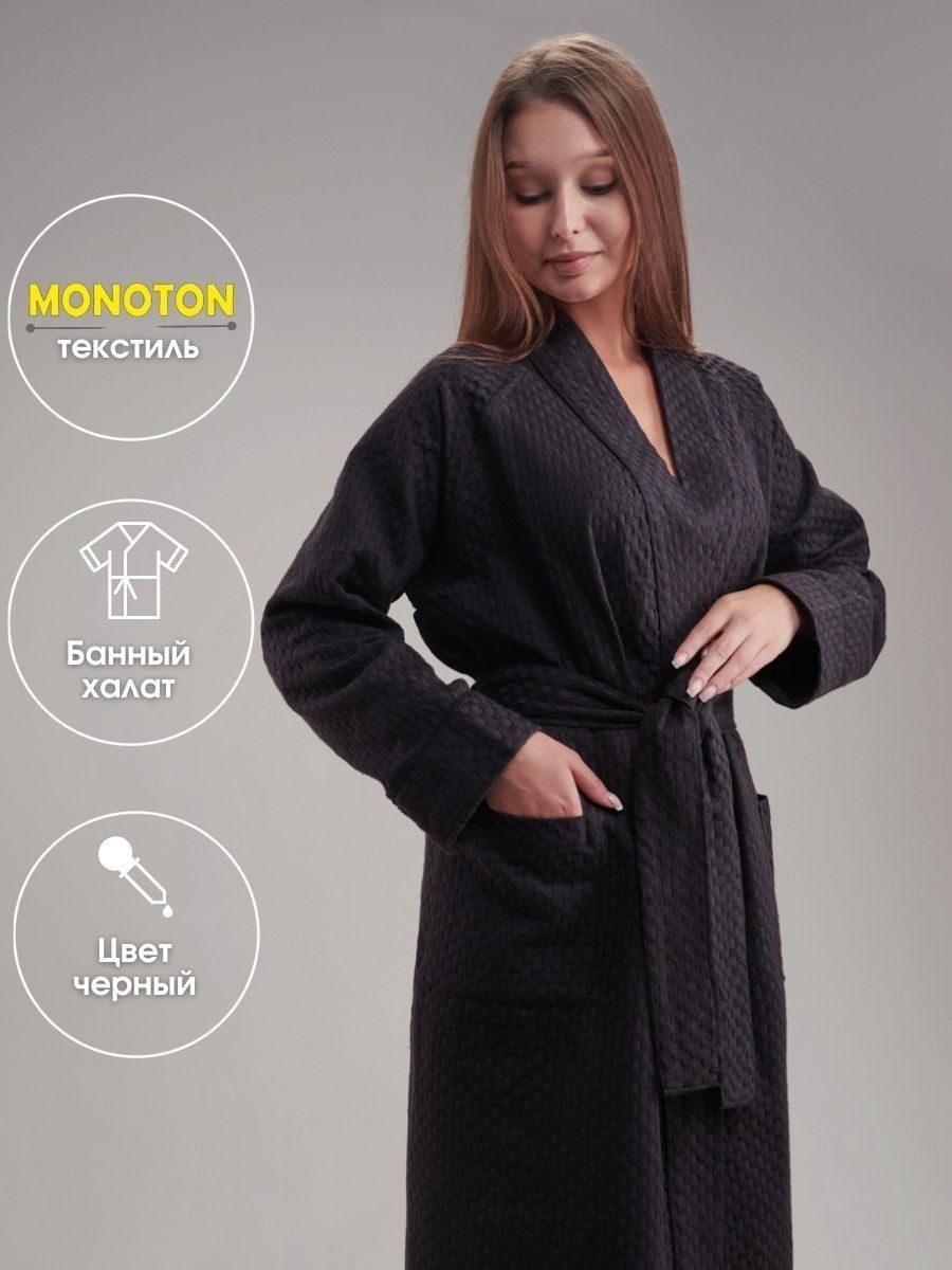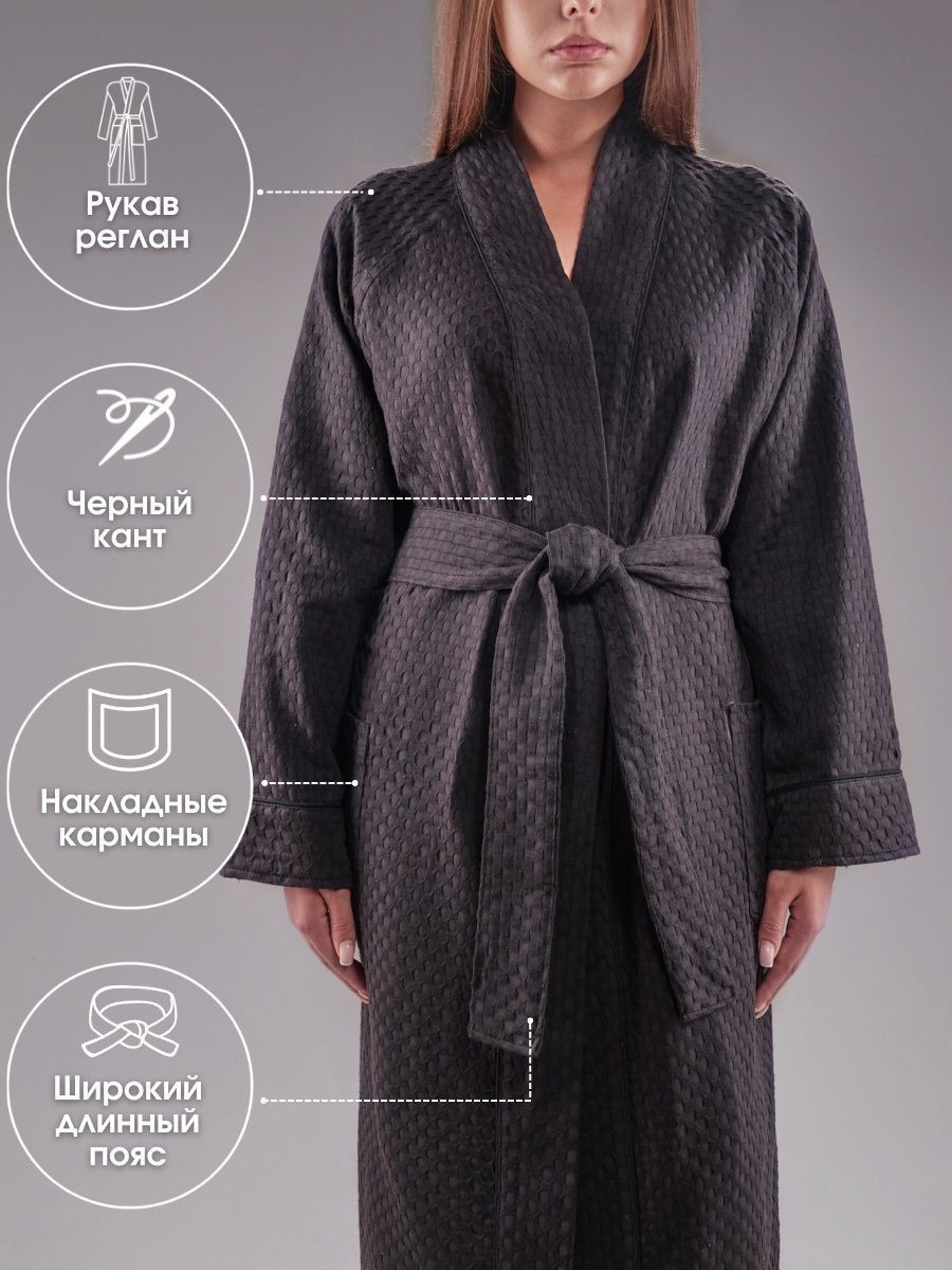 Халат на запах с длинными рукавами реглан, дополнен большими карманами и широким поясом, удобным воротником. Изделие украшает лаконичная отделка - черный кант по вороту, манжету рукава и красота вафельного полотна с нежной ячеистой структурой. Легкий и удобный халат отличается повышенной впитываемостью и отличным внешним видом, который сохранится даже после многочисленных стирок, а ячейки приобретут более выраженную глубину. Плотность полотна - «вафли»: 200 г/кв.м. Мягко облегающая тело ткань (100% хлопок) легкая и дышащая, она прекрасно пропускает воздух, отлично впитывает воду и быстро высыхает. Текстильный халатик дополнен петелькой для подвешивания на крючок. Мягкий и уютный банный халатик без застежки приятно надеть после горячей ванны или бодрящего душа, сауны, бани или бассейна. Удобную вещь можно накинуть на плечи утром сразу после пробуждения, носить дома во время отдыха. Эстетичная модель из натурального материала в фасоне на запах подойдет для беременных женщин и кормящих матерей, для роддома. Изделие выполнено в больших и маленьких размерах от 40-го до 58-го: вы можете подобрать идеально подходящую одежду по таблице размеров на фотографии в левой части карточки товара с подробными мерками. Красивое хлопковое кимоно дополнит гардероб взрослых женщин и девушек, девочек - подростков любого роста: высоких и невысоких, любой комплекции: полных, стройных и худеньких. Вафельный халат с нежным фактурным рисунком - идеальный подарок для любимой девушки, жены, мамы или бабушки на день рождения и любой праздник, приятный свадебный презент или на Новый год. Халатик приобретают, как отельный для гостиниц и отелей, используют для массажа и салоны красоты. Халат безусловно станет хорошим подарком маме, бабушке, подруге или коллеге, а также отличным подарком на новоселье и просто так. рекомендации по уходу: перед первым использованием рекомендуется стирка в холодной воде, затем изделие стирают в деликатном или ручном режиме при температуре воды не выше 40 градусов. Отбеливание и химчистка запрещены, как и сушка на отопительных приборах. Будьте внимательны, соблюдайте рекомендации, возможна усадка после стрики. Сушить в естественном виде на плечиках, гладить с паром при температуре 150 градусов. Халат поставляется в эстетичной упаковке - удобной сумке на молнии, с ручкой.