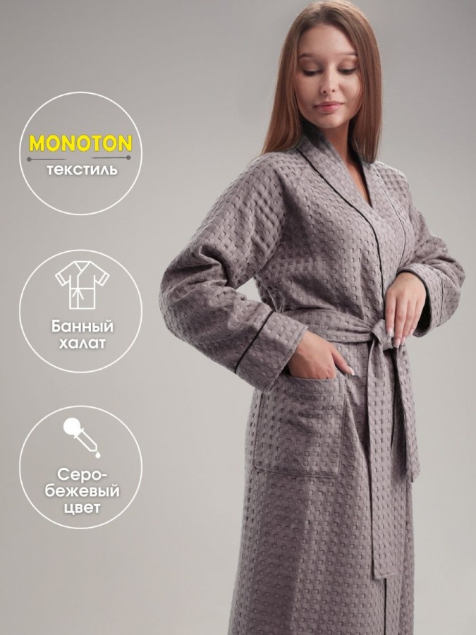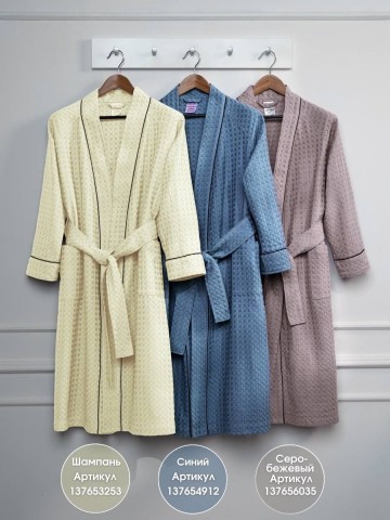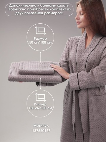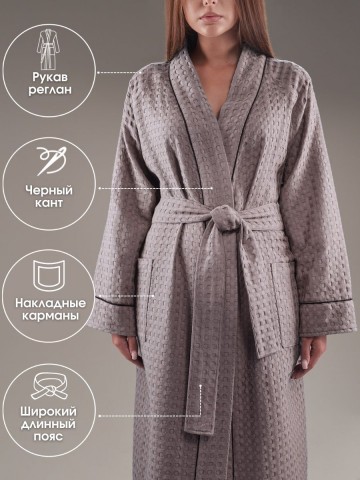 Халат на запах с длинными рукавами реглан, дополнен большими карманами и широким поясом, удобным воротником. Изделие украшает лаконичная отделка - черный кант по вороту, манжету рукава и красота вафельного полотна с нежной ячеистой структурой. Легкий и удобный халат отличается повышенной впитываемостью и отличным внешним видом, который сохранится даже после многочисленных стирок, а ячейки приобретут более выраженную глубину. Плотность полотна - «вафли»: 200 г/кв.м. Мягко облегающая тело ткань (100% хлопок) легкая и дышащая, она прекрасно пропускает воздух, отлично впитывает воду и быстро высыхает. Текстильный халатик дополнен петелькой для подвешивания на крючок. Мягкий и уютный банный халатик без застежки приятно надеть после горячей ванны или бодрящего душа, сауны, бани или бассейна. Удобную вещь можно накинуть на плечи утром сразу после пробуждения, носить дома во время отдыха. Эстетичная модель из натурального материала в фасоне на запах подойдет для беременных женщин и кормящих матерей, для роддома. Изделие выполнено в больших и маленьких размерах от 40-го до 58-го: вы можете подобрать идеально подходящую одежду по таблице размеров на фотографии в левой части карточки товара с подробными мерками. Красивое хлопковое кимоно дополнит гардероб взрослых женщин и девушек, девочек - подростков любого роста: высоких и невысоких, любой комплекции: полных, стройных и худеньких. Вафельный халат с нежным фактурным рисунком - идеальный подарок для любимой девушки, жены, мамы или бабушки на день рождения и любой праздник, приятный свадебный презент или на Новый год. Халатик приобретают, как отельный для гостиниц и отелей, используют для массажа и салоны красоты. Халат безусловно станет хорошим подарком маме, бабушке, подруге или коллеге, а также отличным подарком на новоселье и просто так. рекомендации по уходу: перед первым использованием рекомендуется стирка в холодной воде, затем изделие стирают в деликатном или ручном режиме при температуре воды не выше 40 градусов. Отбеливание и химчистка запрещены, как и сушка на отопительных приборах. Будьте внимательны, соблюдайте рекомендации, возможна усадка после стрики. Сушить в естественном виде на плечиках, гладить с паром при температуре 150 градусов. Халат поставляется в эстетичной упаковке - удобной сумке на молнии, с ручкой.