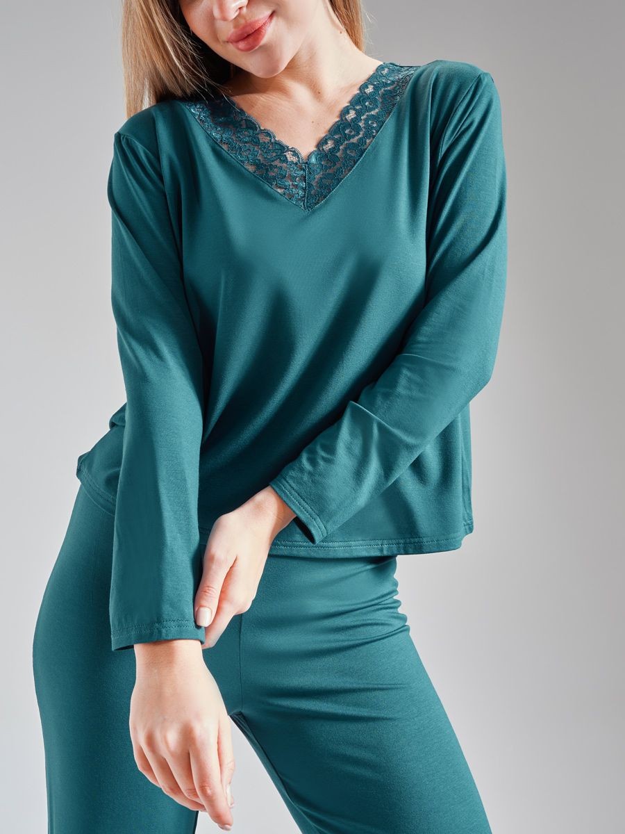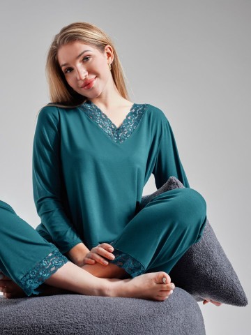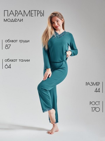Пижама со штанами из вискозы с кружевными деталями - это идеальное сочетание комфорта и элегантности для домашнего отдыха. Пижама для женщин состоит из футболки с длинным рукавом и V- образным вырезом горловины и брюк с кружевом. Вискозный материал приятен на ощупь, мягок и обеспечивает хорошую вентиляцию, что важно для комфортного сна. Кружевные детали придают пижаме изысканный и женственный вид, делая ее подходящей как для повседневного ношения, так и для особых случаев, когда нужно выглядеть элегантно и ухоженно дома. Пижама будет отличным, практичным и полезным подарком для женщин, девушек, беременных, мамы, бабушки на праздники, день рождения,14 февраля, 8 марта, День всех влюбленных.