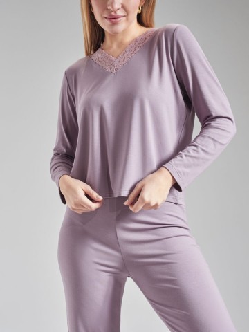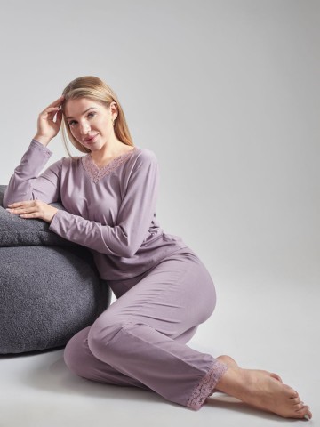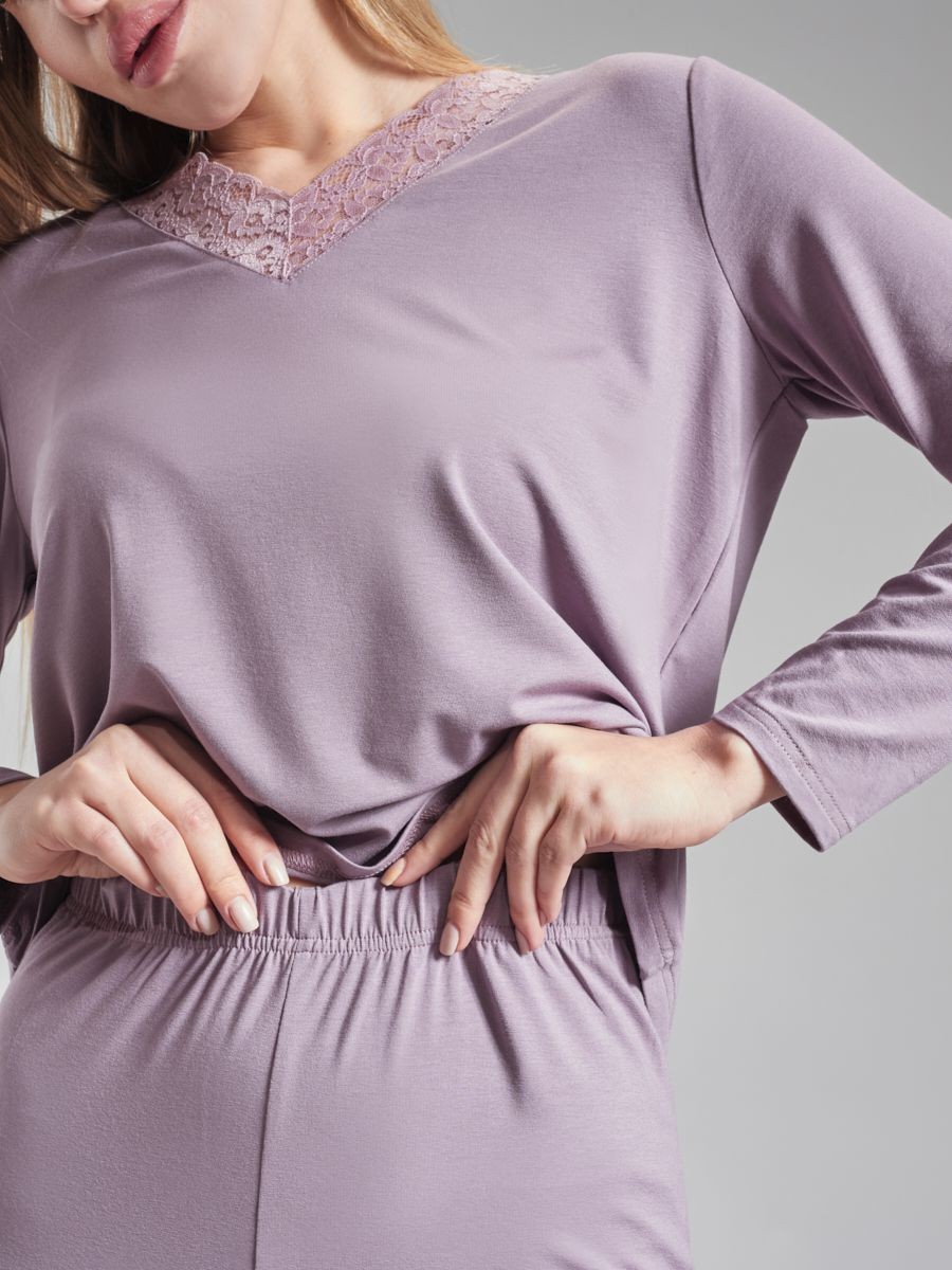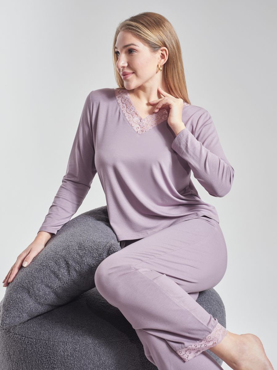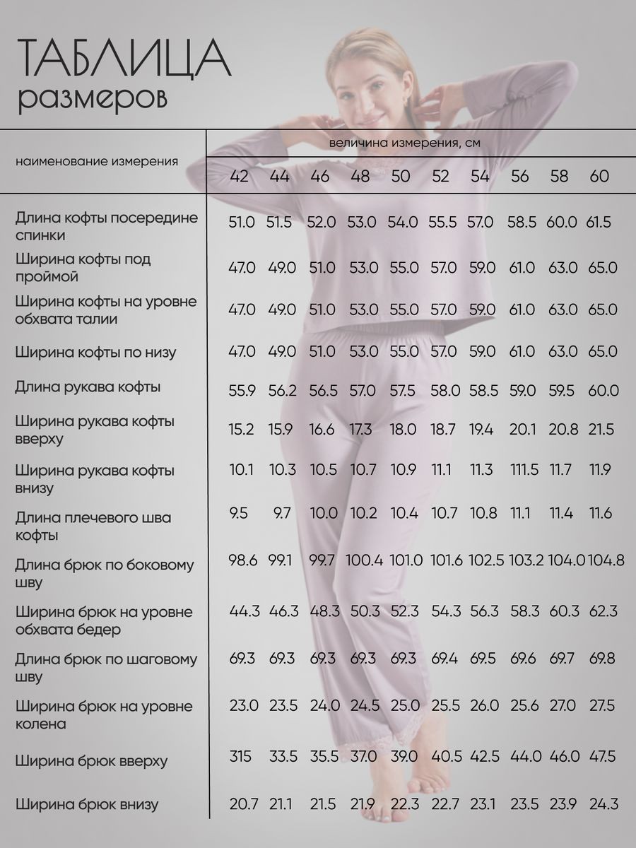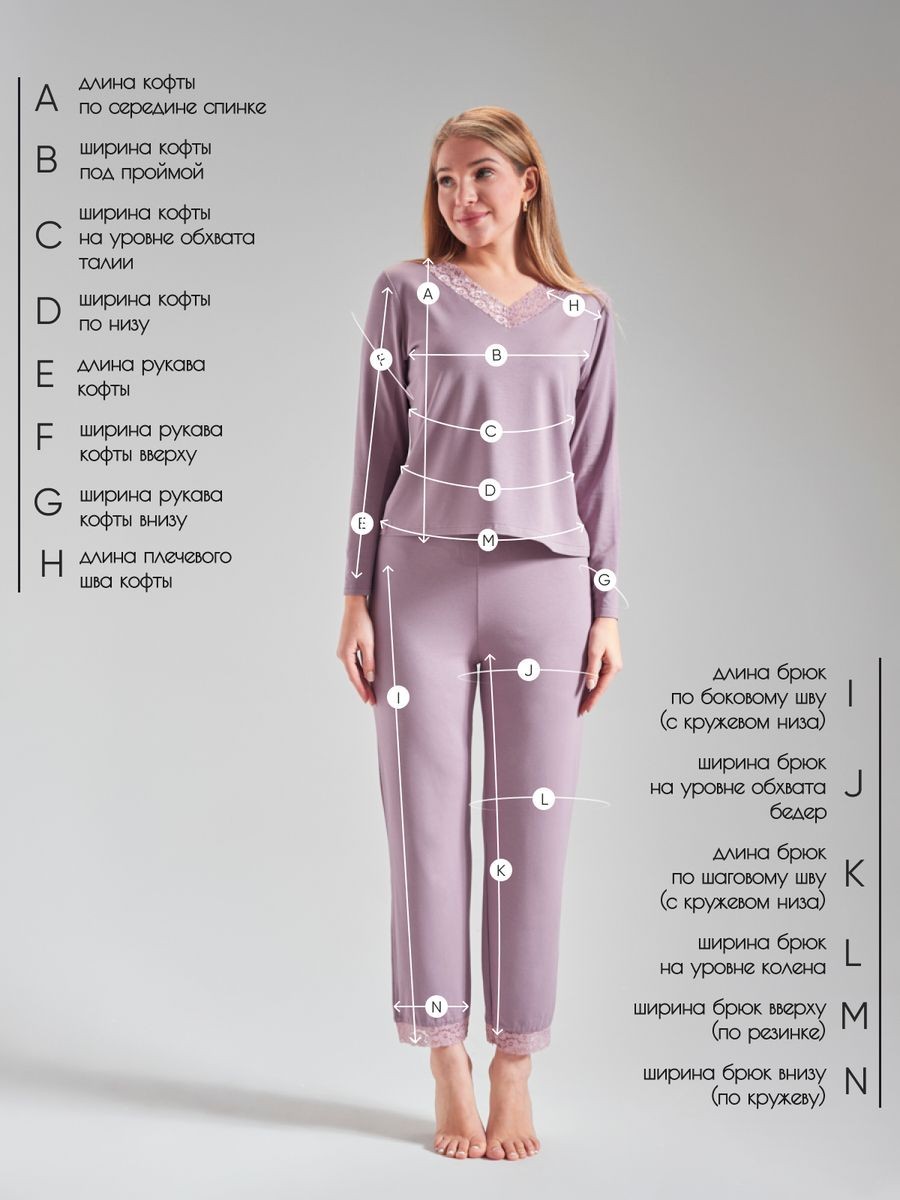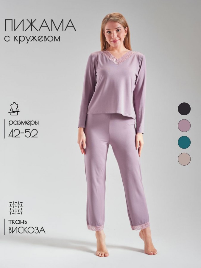 Пижама со штанами для женщин из вискозы с кружевными деталями - это идеальное сочетание комфорта и элегантности для домашнего отдыха. Сосотоит из футболки с длинным рукавом и V- образным вырезом горловины и брюк с кружевом. Вискозный материал приятен на ощупь, мягок и обеспечивает хорошую вентиляцию, что важно для комфортного сна. Кружевные детали придают пижаме изысканный и женственный вид, делая ее подходящей как для повседневного ношения, так и для особых случаев, когда нужно выглядеть элегантно и ухоженно дома. Пижама будет отличным, практичным и полезным подарком для женщин, девушек, беременных, мамы, бабушки на праздники, день рождения,14 февраля, 8 марта, День всех влюбленных.