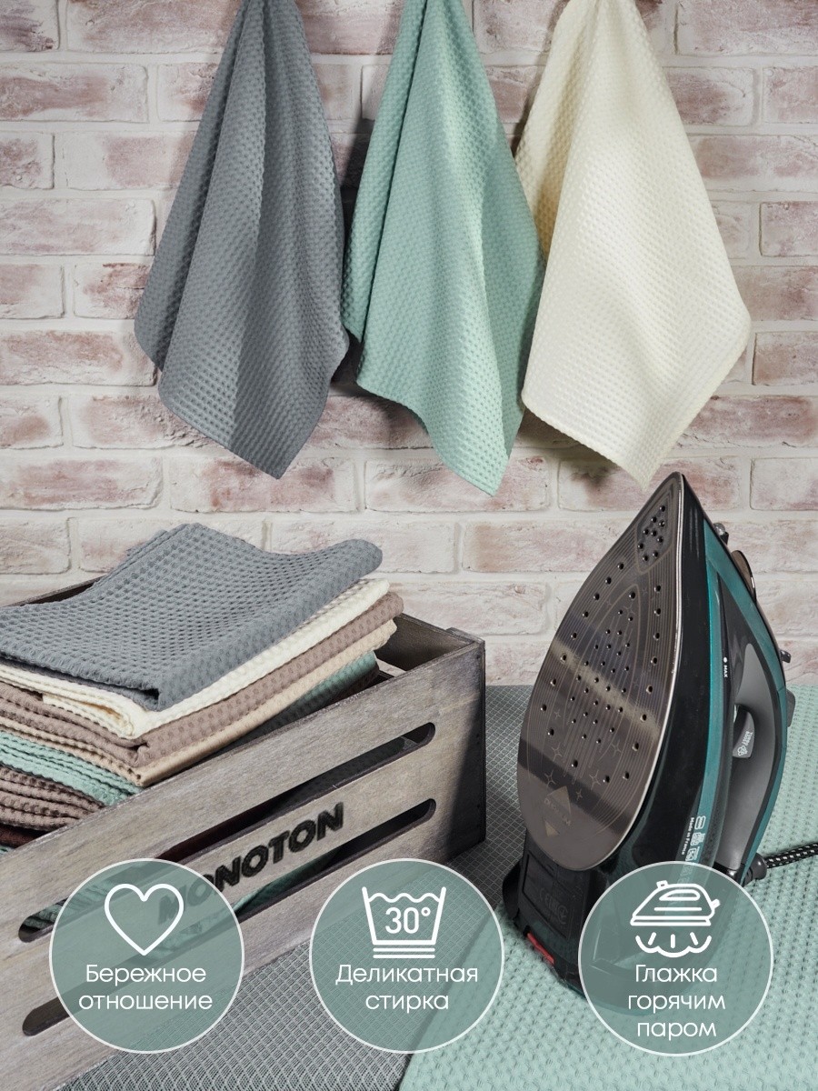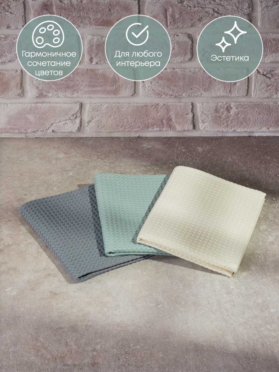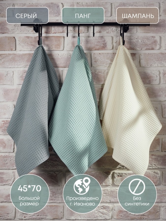 Набор вафельных полотенец из трех штук от компании MONOTON-Текстиль представлен в стильных сочетаниях топовых оттенков, которые украсят вашу кухню. Быстросохнущий аксессуар выполнен из 100% хлопка в размере 45 х 70 см. Хлопковые полотенца отлично впитывают и быстро сохнут, модель отличается увеличенной плотностью (240 г/кв.м.) и универсальным размером квадратной ячейки (7 х 7 мм). Тактильно приятные, безворсовые полотенчики удобнее, чем салфетки, большие тряпки или маленькие тряпочки: незаменимый кухонный атрибут всегда под рукой, если нужно вытереть руки или смахнуть крошки со стола. По середине длинной стороны имеются цветные петельки из натурального хлопка, для удобства подвешивания, они исполнены в тон изделия. Стильные хлопковые полотенчики представлены в красивых цветовых сочетаниях. Со вкусом подобранные сочетания и нежная палитра украсят вашу кухню, станут приятной деталью интерьера для кухни, которая будет радовать вас каждый день. Универсальные многоразовые полотенца с удобной петлей отлично подойдут для ежедневной уборки, помогут очистить столовые приборы, стекло и посуду, убрать ванну и протереть от воды душевую кабину. Вафельные полотенца с тактильно приятной клеткой подойдут для рук и лица, их можно повесить в ванной около зеркала. Домашние или дачные, удобные аксессуары в клетку для наведения чистоты во всем доме подойдут к любому интерьеру, гармоничное сочетание цветов и нежный лаконичный декор понравятся взрослым и детям, женщинам и мужчинам, подросткам, девочкам и мальчикам. Качественный текстиль подойдет для всей семьи: для родителей: мамы и папы, бабушки. Стильные и уютные полотенчики в комплекте из трех предметов разных цветов станут хорошим подарком для любимой девушки, для жены, для мамы, сестры или подруги на Новый год или Рождество, 8 Марта или День святого Валентина, а также мужчине на 23 февраля. Полотенца кухонные станут прекрасным подарком на новоселье, свадьбу или лаконичным декором или прекрасным дополнением интерьера любой кухни. Сделано в России, производство г. Иваново, текстиль Иваново, Ивановский текстиль. У нас есть акции и распродажи, вы можете купить наши товары в подарок со скидкой!