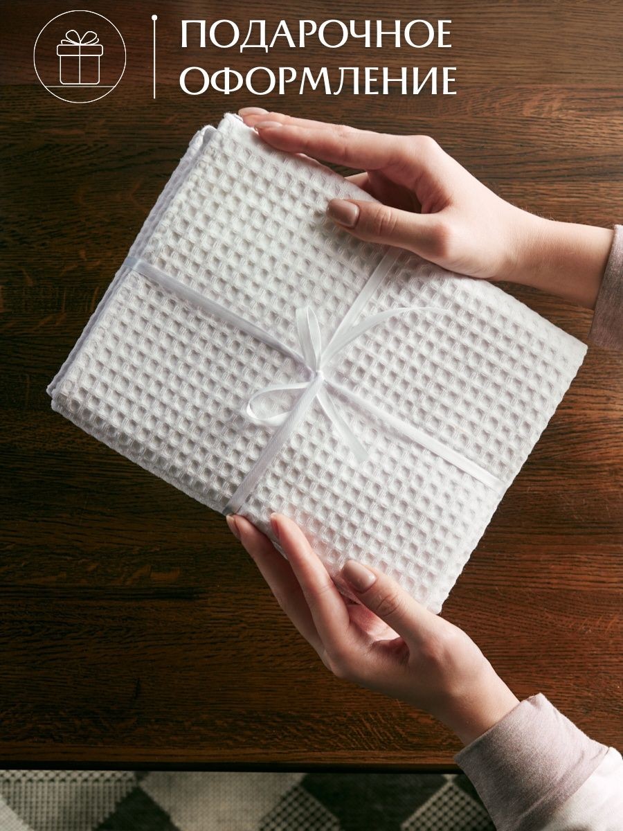 Комплект кухонных полотенец белого цвета/белый, большого размера 45х70см из 3 шт, из натурального хлопка, с плотностью ткани 240 г/м² и размером ячейки 7 мм х 7 мм. Эти полотенца обладают отличной впитывающей способностью, что делает их идеальным выбором для ухода за посудой, поверхностями и руками как в кухне, так и в ванной комнате. Стильные однотонные цвета подойдут для любого интерьера, придавая уют и функциональность. Каждое полотенце имеет цветные петельки из натурального хлопка по середине длинной стороны, что облегчает хранение и подвешивание. Эти детали придают удобство в использовании и позволяют разместить полотенца на своем месте. Прежде чем использовать полотенца, рекомендуется прополоскать и высушить их естественным способом, чтобы насладиться максимальной мягкостью и впитывающими свойствами каждого полотенца. Наши вафельные кухонные полотенца из натурального хлопка не только эффективно выполнят свои функциональные обязанности, но и станут стильным и удобным элементом вашей кухни и ванной комнаты. Полотенца аккуратно перевязаны подарочной атласной лентой, они прекрасно подойдут в качестве подарка близким и коллегам, подарок для мамы, подарок для девушки, подарок для бабушки. Универсальный подарок на каждый день, подарок на День рождение, подарок на 8 Марта, подарок на 14 февраля и подарок на День святого Валентина, подарок на новоселье, для мужчины на 23 февраля. Порадуйте своих близких, они будут приятно удивлены стильному и практичному подарку.