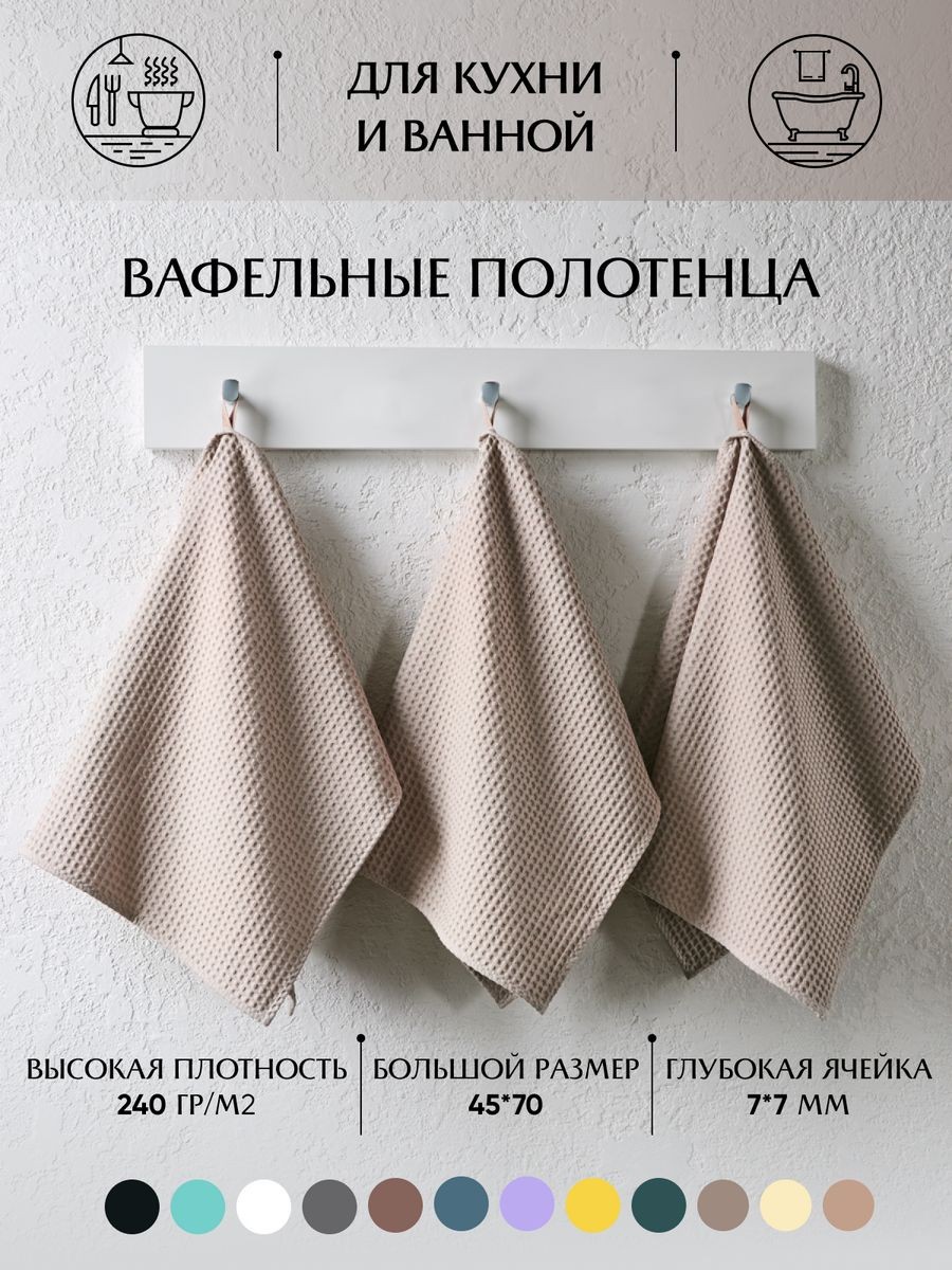 Комплект кухонных полотенец большого размера 45х70см из 3 шт, из натурального хлопка, с плотностью ткани 240 г/м² и размером ячейки 7 мм х 7 мм. Эти полотенца обладают отличной впитывающей способностью, что делает их идеальным выбором для ухода за посудой, поверхностями и руками как в кухне, так и в ванной комнате. Стильные однотонные цвета подойдут для любого интерьера, придавая уют и функциональность. Каждое полотенце имеет цветные петельки из натурального хлопка по середине длинной стороны, что облегчает хранение и подвешивание. Эти детали придают удобство в использовании и позволяют разместить полотенца на своем месте. Прежде чем использовать полотенца, рекомендуется прополоскать и высушить их естественным способом, чтобы насладиться максимальной мягкостью и впитывающими свойствами каждого полотенца. Наши вафельные кухонные полотенца из натурального хлопка не только эффективно выполнят свои функциональные обязанности, но и станут стильным и удобным элементом вашей кухни и ванной комнаты. Полотенца аккуратно перевязаны подарочной атласной лентой, они прекрасно подойдут в качестве подарка близким и коллегам, подарок для мамы, подарок для девушки, подарок для бабушки. Универсальный подарок на каждый день, подарок на День рождение, подарок на 8 Марта, подарок на 14 февраля и подарок на День святого Валентина, подарок на новоселье, для мужчины на 23 февраля. Порадуйте своих близких, они будут приятно удивлены стильному и практичному подарку.