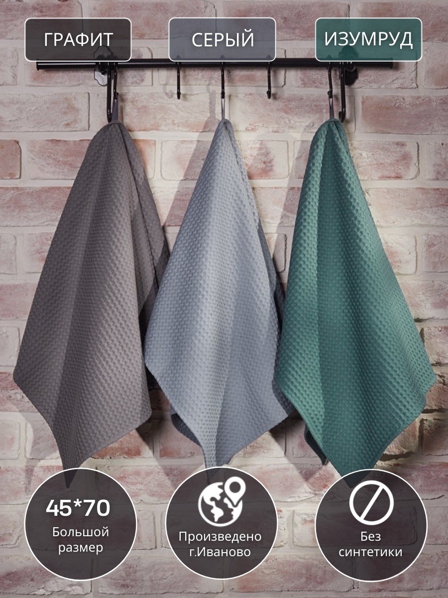 Набор вафельных полотенец из трех штук от компании MONOTON-Текстиль представлен в стильных сочетаниях топовых оттенков, которые украсят вашу кухню. Быстросохнущий аксессуар выполнен из 100% хлопка в размере 45 х 70 см. Хлопковые полотенца отлично впитывают и быстро сохнут, модель отличается увеличенной плотностью (240 г/кв.м.) и универсальным размером квадратной ячейки (7 х 7 мм). Тактильно приятные, безворсовые полотенчики удобнее, чем салфетки, большие тряпки или маленькие тряпочки: незаменимый кухонный атрибут всегда под рукой, если нужно вытереть руки или смахнуть крошки со стола. По середине длинной стороны имеются цветные петельки из натурального хлопка, для удобства подвешивания, они исполнены в тон изделия. Стильные хлопковые полотенчики представлены в красивых цветовых сочетаниях. Со вкусом подобранные сочетания и нежная палитра украсят вашу кухню, станут приятной деталью интерьера для кухни, которая будет радовать вас каждый день. Универсальные многоразовые полотенца с удобной петлей отлично подойдут для ежедневной уборки, помогут очистить столовые приборы, стекло и посуду, убрать ванну и протереть от воды душевую кабину. Вафельные полотенца с тактильно приятной клеткой подойдут для рук и лица, их можно повесить в ванной около зеркала. Домашние или дачные, удобные аксессуары в клетку для наведения чистоты во всем доме подойдут к любому интерьеру, гармоничное сочетание цветов и нежный лаконичный декор понравятся взрослым и детям, женщинам и мужчинам, подросткам, девочкам и мальчикам. Качественный текстиль подойдет для всей семьи: для родителей: мамы и папы, бабушки. Стильные и уютные полотенчики в комплекте из трех предметов разных цветов станут хорошим подарком для любимой девушки, для жены, для мамы, сестры или подруги на Новый год или Рождество, 8 Марта или День святого Валентина, а также мужчине на 23 февраля. Полотенца кухонные станут прекрасным подарком на новоселье, свадьбу или лаконичным декором или прекрасным дополнением интерьера любой кухни. Сделано в России, производство г. Иваново, текстиль Иваново, Ивановский текстиль. У нас есть акции и распродажи, вы можете купить наши товары в подарок со скидкой!